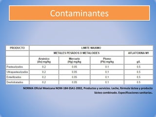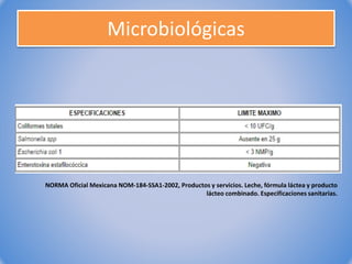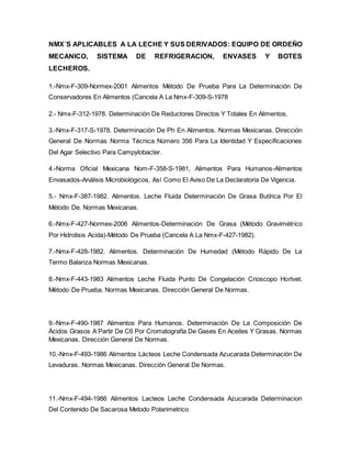 NORMAS SANITARIAS PROYECTO DE NORMA OFICIAL MEXICANA NOM-035-SSA1-1993 BIENES Y SERVICIOS. Proteínas de la leche expresadas en sólidos lácteos no grasos mm 34 mín. NOM-116-SSA1-1994 Proteínas de la leche expresadas en sólidos lácteos no grasos.