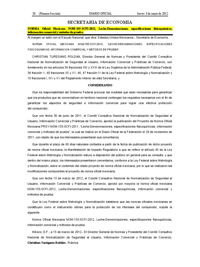 NOM-116-SSA1-1994 Proteínas de la leche expresadas en sólidos lácteos no grasos. De la leche de manera que no se modifi que la proporción entre la proteína del suero y la caseína de la leche utilizada como materia prima. Leche fórmula láctea producto lácteo combinado y derivados lácteos. Solución NaOH para la titulación de la leche. De la cantidad de CO2 disuelto en la leche. Al margen un sello con el Escudo Nacional que dice. Leche y productos lácteos segunda edición Normas para productos lácteos.