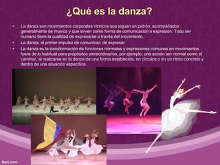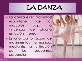 Si alguna vez has visto bailar a un profesional de la danza debes haber notado su increíble sentido de equilibrio y control corporal. La danza o el baile es es una forma de arte en donde se. La danza sirve para expresar diversos contenidos emocionales o culturales.